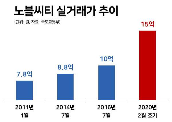 ‘노블씨티’는 총 10가구에 불과한 나홀로 단지다. 가구 수가 적은만큼 실거래도 거의 없다. 국토교통부에 등록된 실거래가를 바탕으로 시세를 파악하기는 어렵다. 이 단지에서 가장 많은 주택형은 전용면적 114㎡(4가구)와 111㎡(공급면적 37평, 3가구)다. 이 중 가장 최근 거래는 2016년 7월 111㎡가 10억원에 팔린 것이다. 직전 거래인 8억8000만원(2014년 7월)보다 1억2000만원 높은 금액이다. 현재 온라인 부동산 중개 사이트에는 15억원에 매물로 나와 있다. 공급면적 기준으로 따지면 3.3㎡당 4000만원쯤 된다.