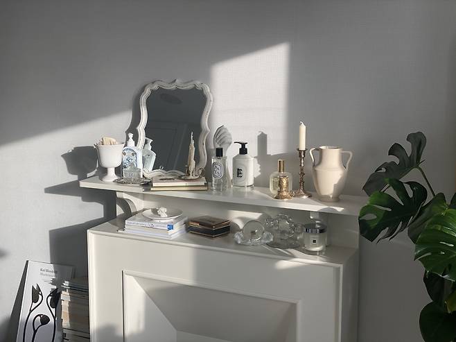 저희 집은 수납장이 필요 없을 만큼 붙박이장이 잘되어 있어서 공간 활용이 비교적 쉬운 편이에요. 원룸이지만 예쁜 장식장을 놓을 수 있었어요. 거기에 장식할 빈티지 소품들을 하나하나 사러 다니면서 집 꾸미기에 큰 재미를 느끼게 되었고요.