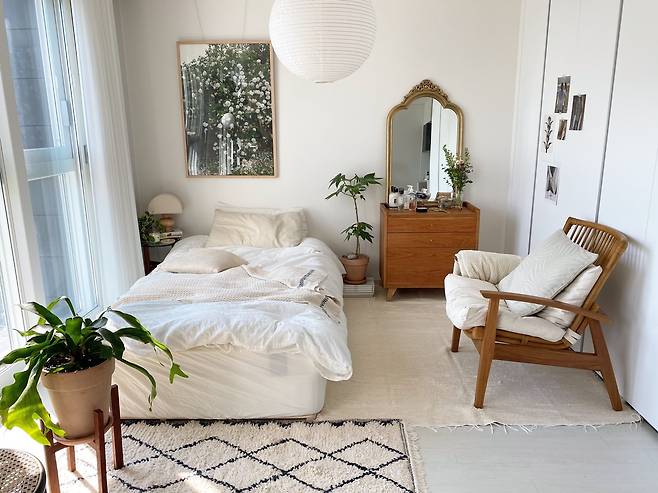 벽에 좋아하는 것들도 붙이고 침대 옆에 식물도 두고 싶은데, 잠자리 근처라 그런지 불편하더라고요. 그래서 여전히 고민 중인 곳이에요. 앞으로 계속 다양하게 변화를 줘볼 생각이에요.