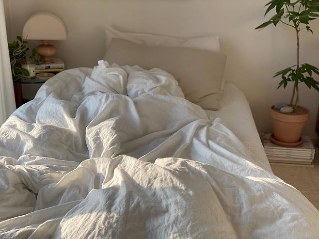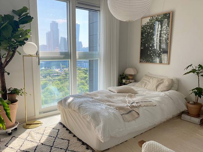 침실은 호텔 침구 특유의 느낌을 내고자 화이트로 구성했습니다. 베이지 컬러와 번갈아 가며 사용하고 있어요.