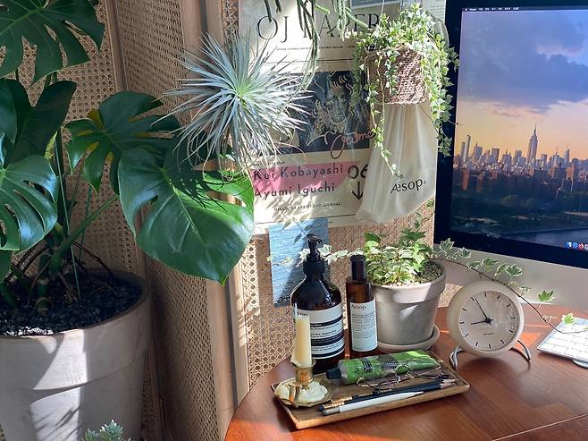 커다란 아이맥이 인테리어상 별로 예쁘진 않지만 이국적으로 꾸며볼 방법이 뭐가 있을까 고민했어요. 제가 발리에서 한 달 정도 머무르면서 거기 샵들에서 영감을 받은 게 아이맥과 라탄과 플랜테리어의 조합이었어요.