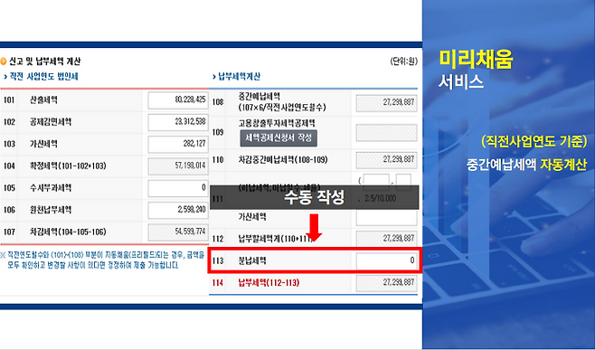 ③ 미리채움 서비스: 직전사업연도 기준 중간예납세액 자동계산