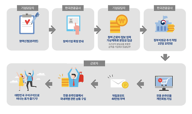 근로자가 20만원을 내면 기업과 정부가 각각 10만원씩을 더해, 총 40만원을 국내 여행 경비로 사용할 수 있게 하는 사업인데요. 올해는 2차 모집까지 신청이 완료되었지만, 매년 하는 사업이니 내년에는 꼭 잊지 말고 참여해 보시면 좋을 것 같아요. :)
