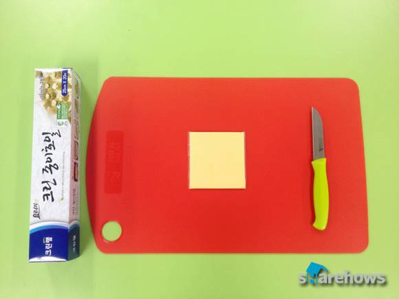 체다슬라이스치즈 먹고싶은 만큼, 도마, 칼, 접시, 종이호일, 전자레인지, 준비시간(3분30초), 전자레인지(1분 30초)