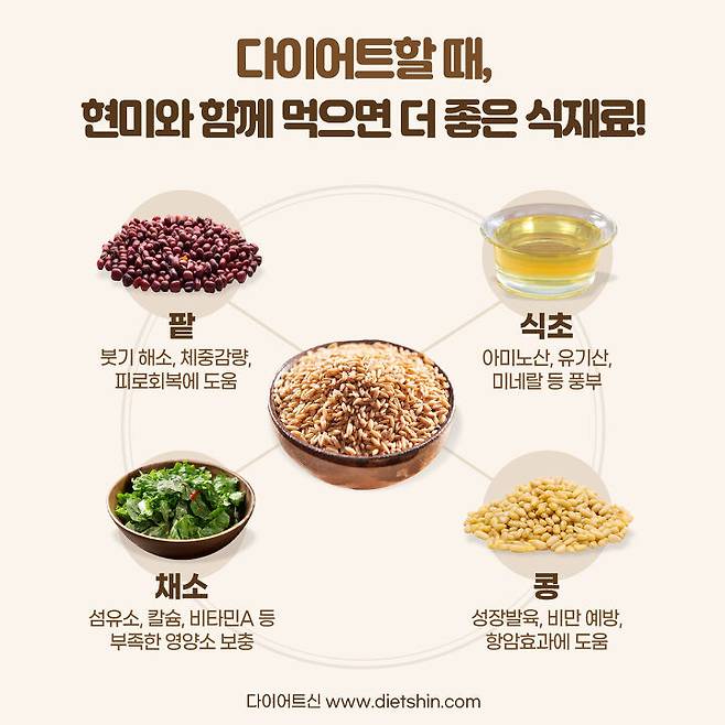 현미는 오래 씹어야 해서 포만감을 주고, 팥은 이뇨작용과 해독작용이 탁월해서 체중관리 할 때 함께 먹으면 좋은 조합이에요.