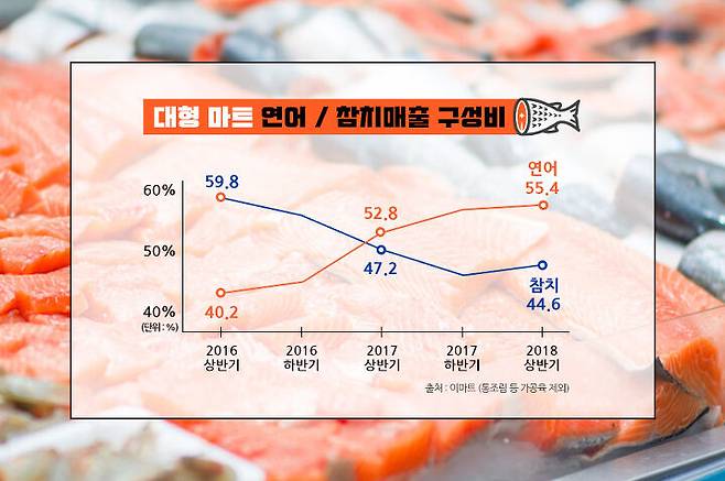 대형마트의 연어와 참치 매출 구성비를 살펴보면 연어가 참치의 매출을 넘어섰고, 광어와 우럭 다음으로 많이 팔리는 생선으로 급부상했어요. 관계자는 "가격이 저렴하고 다양한 방식으로 조리가 가능해 젊은 층에서 인기가 높다"라고 말하는데요.