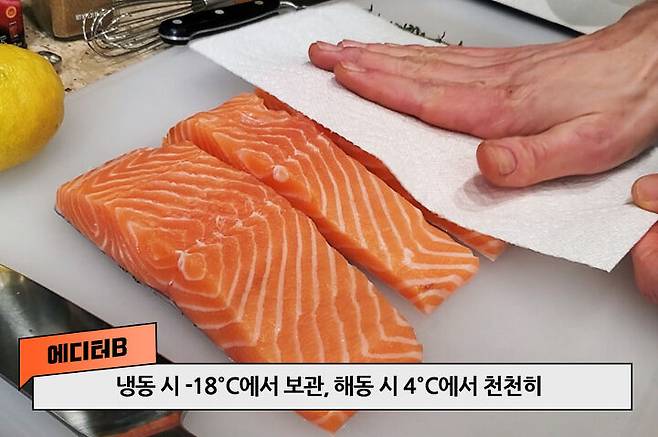 뿐만 아니라 얼음이 녹으며 물이 생기고 육즙이 흘러나오는데요. 어떤 식재료든 물이 공기 중에 닿으며 신선도가 떨어지고 전체적인 부패가 일어납니다. 전문가들은 연어의 신선도를 유지하는 것이 '땀을 관리하는 것'이라고 말해요. 해동하며 생기는 물은 주기적으로 제거해야 하며, 최적의 해동 기간은 1~2일이에요. 해동할 때 실온에 연어를 꺼내 두는 경우가 많은데 절대 금물, 냉장실을 사용해야 합니다.