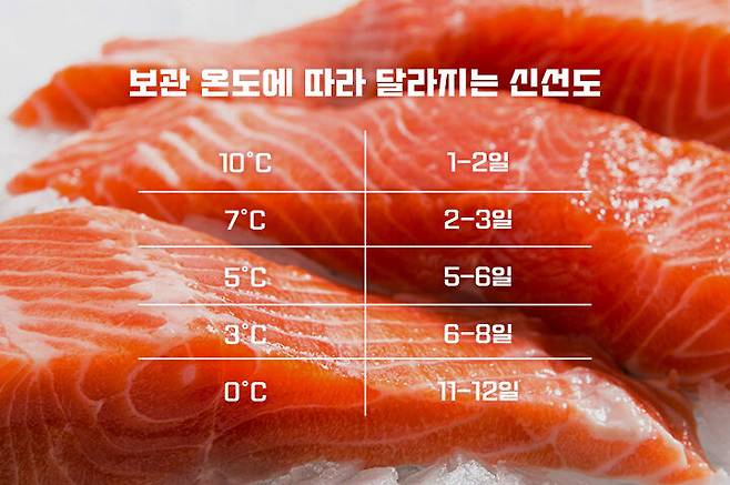 외국계 대형 마트에서 판매량 TOP5안에 무조건 들어간다는 연어 회! 연어는 항상 차갑게 보관되어야 하는데요. 온도에 따라 보관 기간이 달라져요. 이상적인 보관 온도는 0°C에서 -2°C에요.