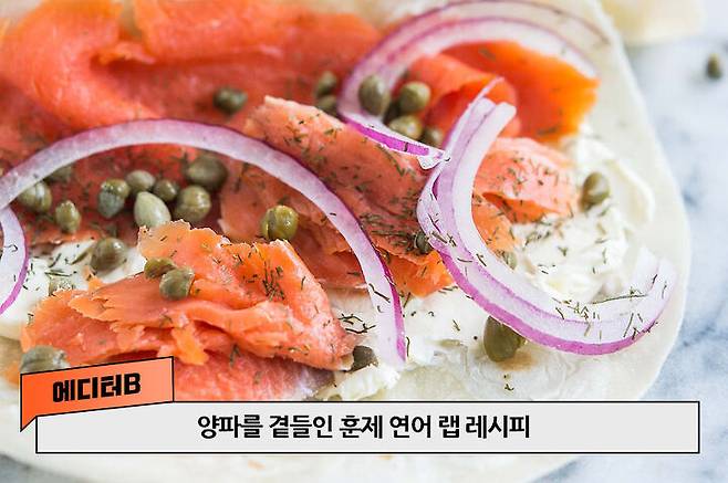 5분이면 완성되는 초간단 훈제 연어 랩입니다. 여기서 포인트는 채 썬 양파인데요. 연어의 기름진 맛을 잡아줘 맛 궁합뿐만 아니라 영양 궁합도 좋아요. 양파의 항산화 성분이 연어 속 오메가3 지방산의 산화를 방지하고, 함께 섭취하면 만성 염증에 도움이 된답니다.