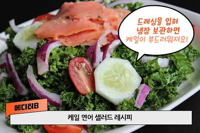 케일이 억세서 먹기 힘드신 분들은 드레싱에 케일을 버무리고 냉장고에 넣어두세요. 케일이 부드러워지는 꿀팁이랍니다.