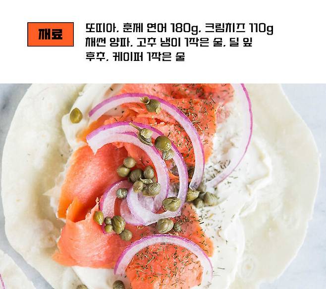 3. 또띠아 위에 크림치즈를 바르고 훈제 연어, 양파, 케이퍼를 올린다.