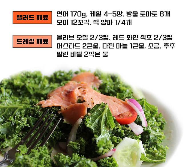 간단하게 만들 수 있는 샐러드 레시피에요. 어떤 야채를 사용해도 괜찮지만 이왕이면 케일을 사용하는 걸 추천해요. 연어처럼 지방질이 많은 생선에 들어있는 비타민D와 케일에 풍부하게 든 칼슘이 결합하면 뼈 건강에 도움이 돼요.