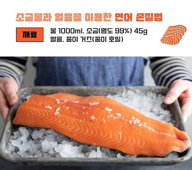 전문 식당에서 사용하는 연어 손질&보관법이에요. 통연어를 먹기 좋게 자른 후 소금과 얼음을 이용해 손질하는 건데요. 연어의 살이 단단해지고 불순물과 잡내를 없애는 장점이 있어요. 연어 특유의 신선한 향과 맛, 탱글한 식감을 느낄 수 있답니다.