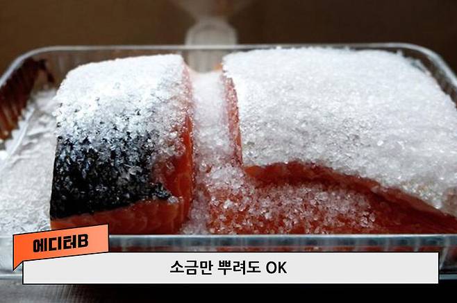 소금물과 얼음으로 연어를 손질하는 과정이 번거로운 분들은 소금만 뿌려서 손질해도 괜찮아요. 연어에 전체적으로 소금을 뿌리고 위에 청주를 도포한 후(청주 생략 가능) 15분 뒤에 찬물이나 얼음 물로 세척하면 돼요. 소금은 탈수 작용이 있어 생선의 잡내를 잡아주고 비린 맛을 없애는 기능이 있어요. 손질한 연어는 공기가 들어가지 않도록 하나씩 종이 포일에 싸 냉장 보관하면 오래 보관하고 먹을 수 있답니다.