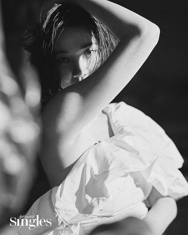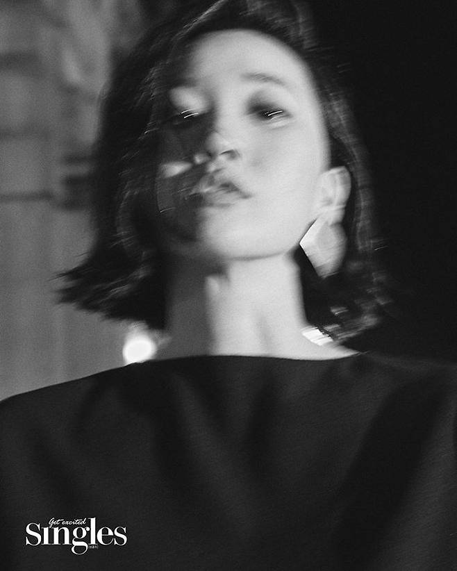 또 다른 컷에서는 원숄더 셔링 디테일 탑을 입고 깊어진 눈빛으로 한층 농염한 분위기를 자아냈다.
