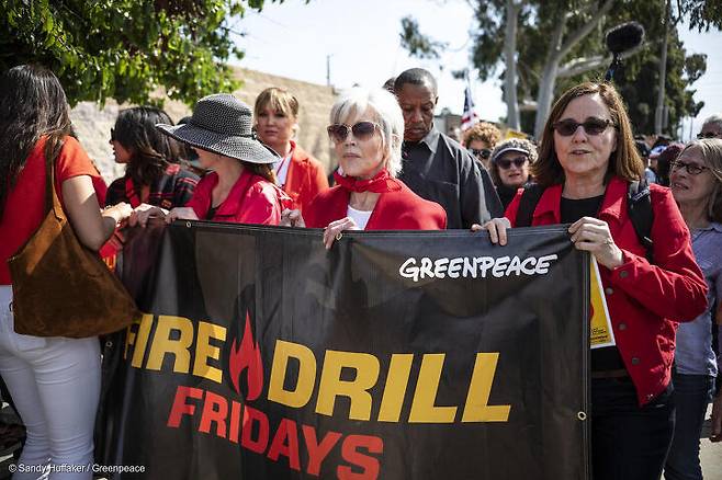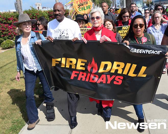 할리우드 원로 배우 제인 폰다는 매주 금요일 미국 의회 앞에서 기후위기 대응을 촉구하는 '파이어 드릴 프라이데이스(Fire Drill Fridays)' 시위를 주최하고 있습니다. 스웨덴 청소년 환경 운동가 그레타 툰베리의 활동에 감명을 받아 파이어 시위를 주최하게 됐다고 하는데요. 그는 기후위기에 대한 관심을 모으고 화두를 던지기 위해 매주 자신이 체포되기 위한 계획을 세우기도 했습니다.