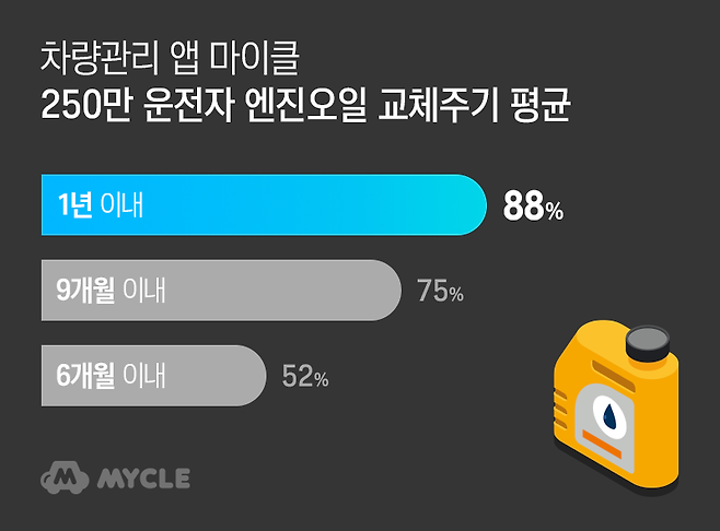 실제로 차량관리 앱 마이클의 250만 운전자들 중 52%의 운전자가 6개월 마다, 75%의 운전자는 9개월 마다, 그리고 88%의 대다수 운전자가 적어도 1년에 한 번은 엔진오일을 교환하고 있는 것으로 나타났는데요.