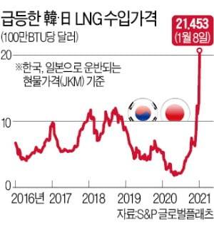 11일 글로벌 에너지 정보분석업체인 스탠더드앤드푸어스 글로벌플라츠에 따르면 지난 8일 한국과 일본 현물시장(JKM)에서 LNG 가격은 100만BTU(열량단위)당 21.453달러를 기록했다. 조사가 시작된 2009년 이후 최고치다. 지난달 초 8.065달러에서 불과 한 달여 만에 세 배 가까이로 뛰었다.