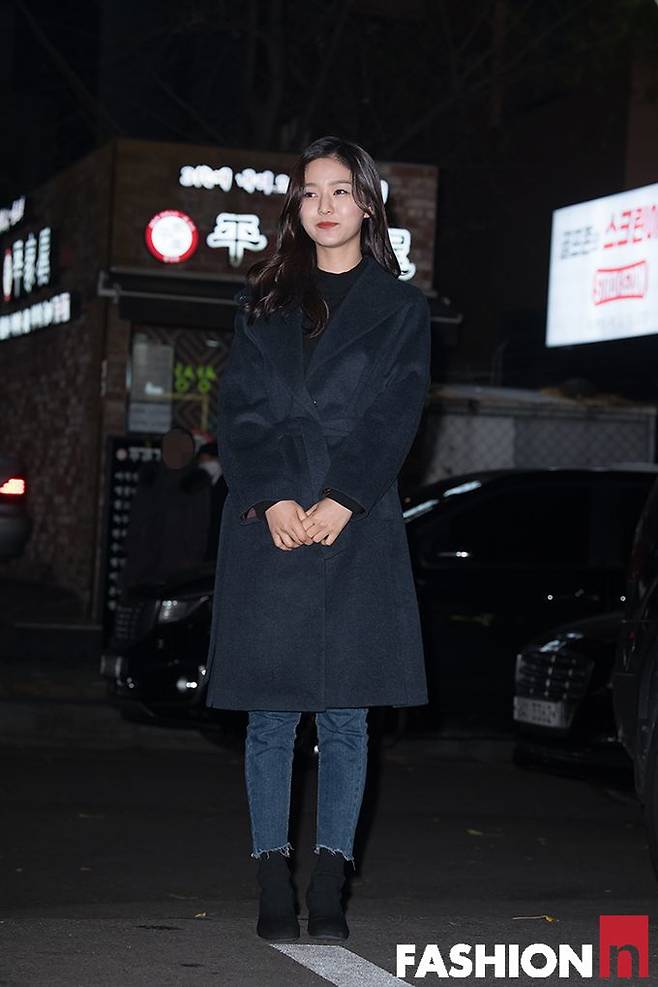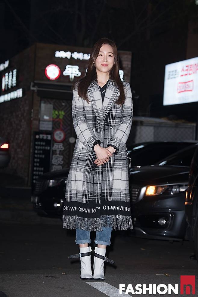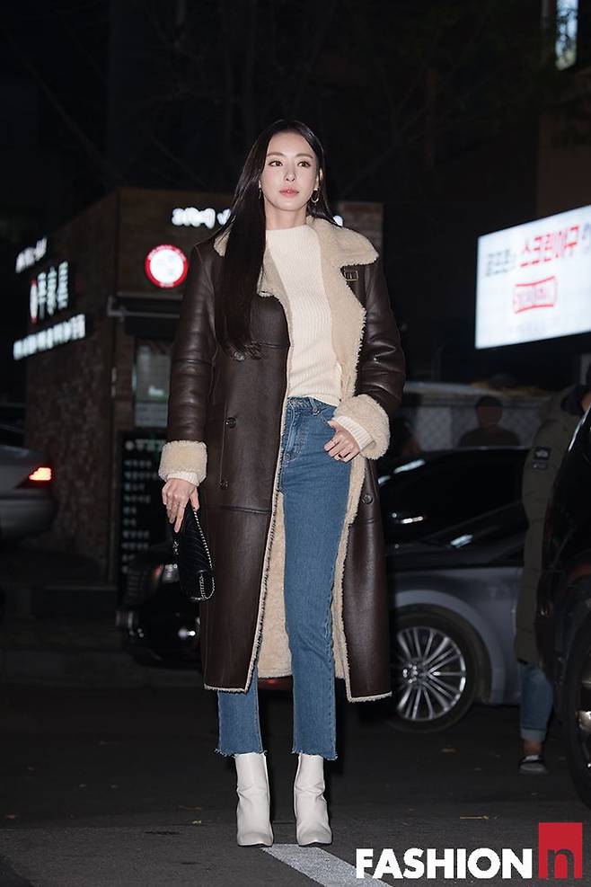 이다희는 딥브라운 롱 무톤 재킷으로 압도적 비율을 뽐냈다. 여기에 세미 부츠컷 데님 팬츠와 화이트 앵클 삭스부츠를 매치해 엣지를 살렸다.