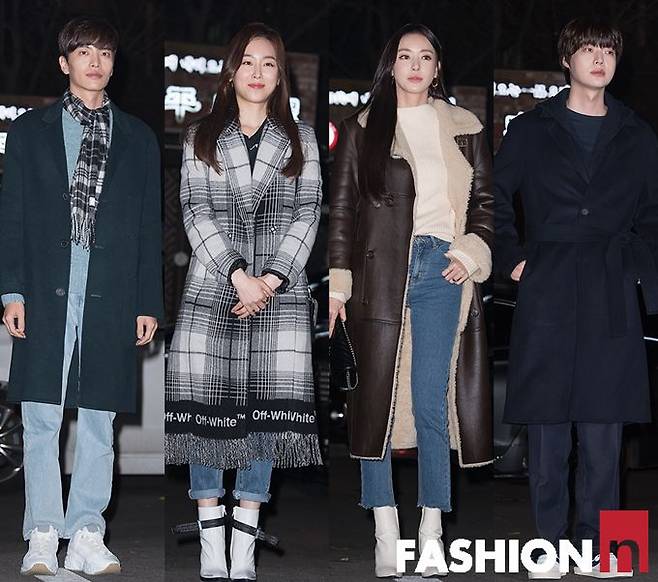 이민기와 서현진, 이다희는 데님 팬츠를 활용한 캐주얼 윈터룩을 연출했다. 이민기는 연한 데님 팬츠 위에 하늘색 니트를 매치하며 톤온톤 스타일링을 완성했고, 싱글 코트와 그레이 체크 패턴 프린지 머플러로 멋을 더했다.