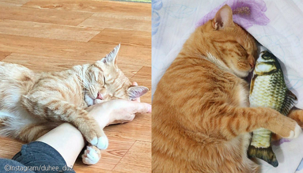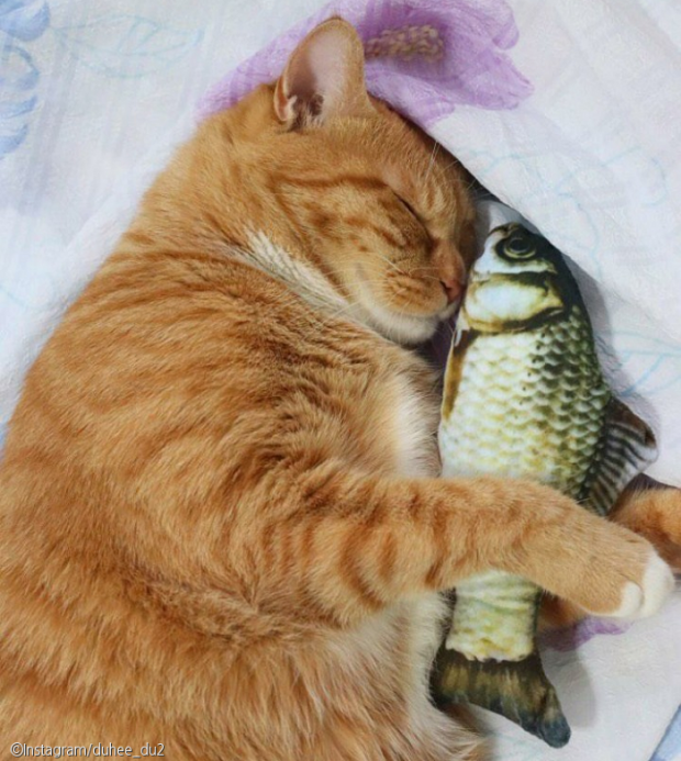 사진 속 고양이는 생선 인형을 품에 꼭 껴안고 '꿀잠'을 자고 있다.