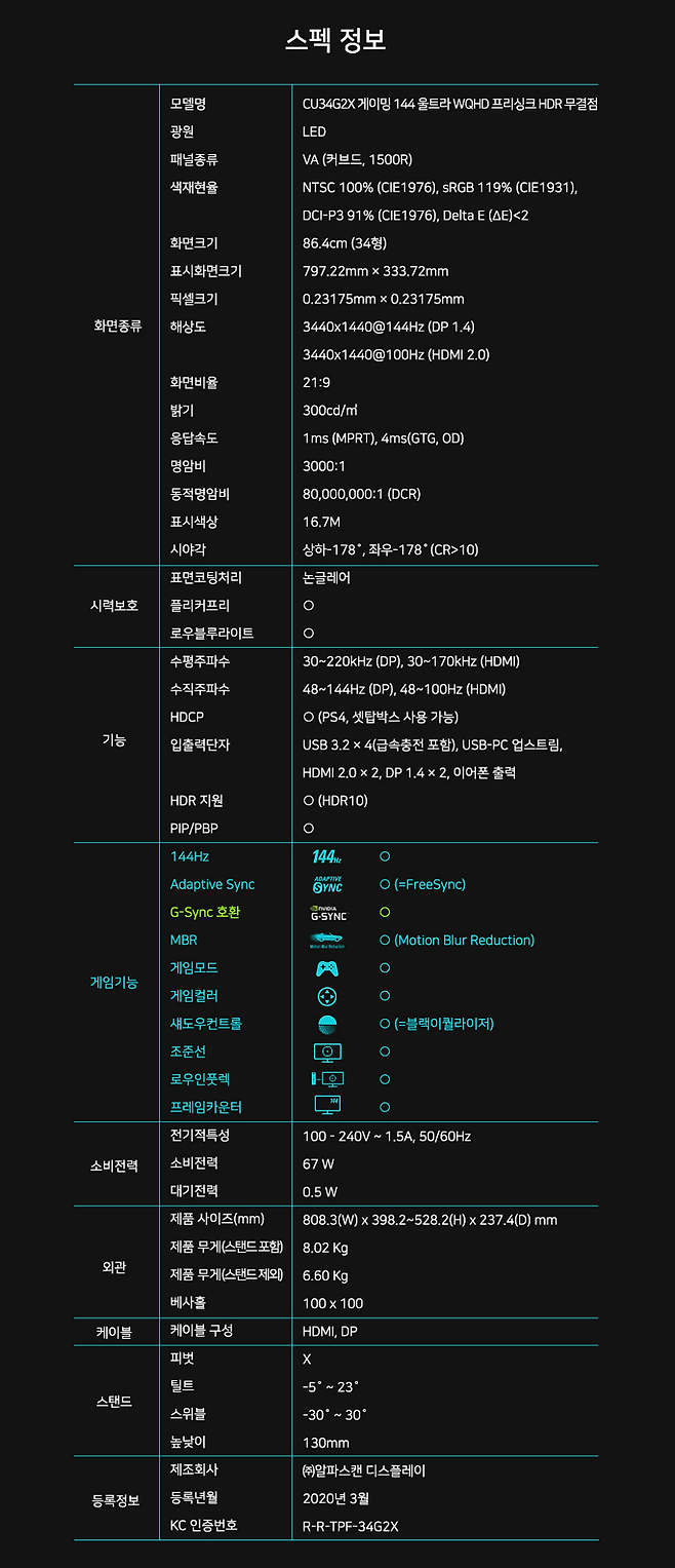 - WQHD(3440x1440) 해상도, 최대 주사율(Refresh Rate) 144Hz의 매끄러운 화면을 지원하는 34형 커브드 게이밍 모니터