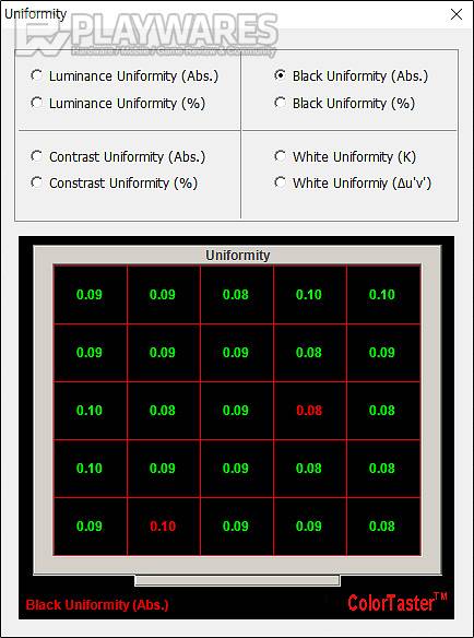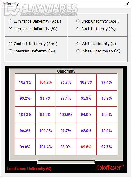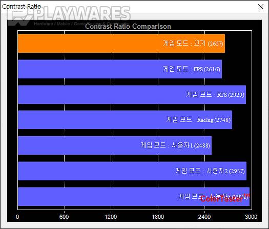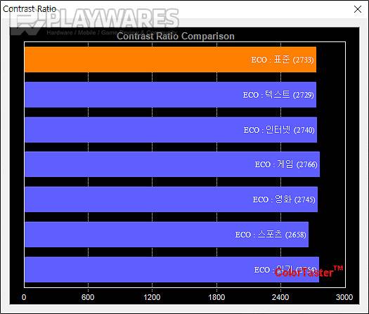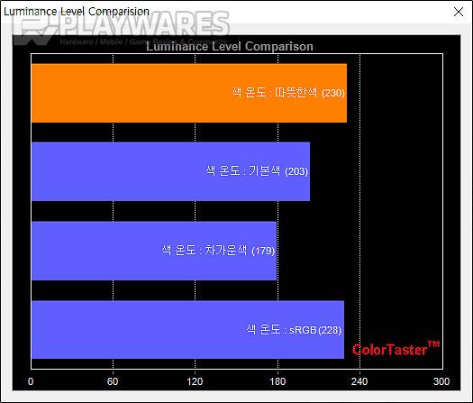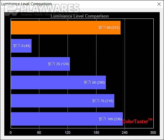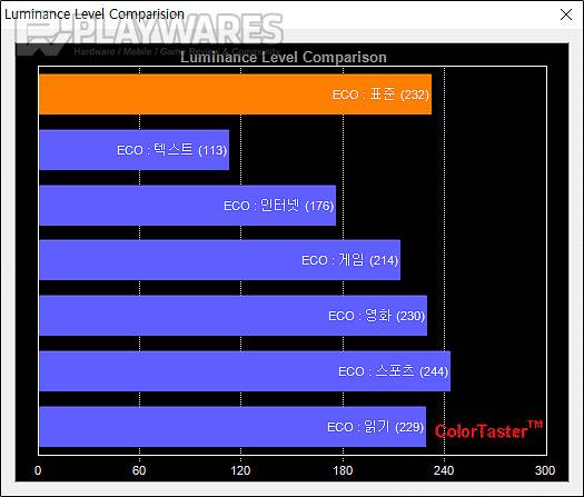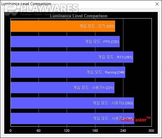 화면의 밝은 정도를 나타내는 휘도는 스펙상 최대 300nit, 계측 결과에서는 기본 밝기 80 기준 231nit, 최고 높은 휘도는 게임 모드의 사용자2,3 프리셋이 적용될 때의 263nit가 확인되고 있습니다. 기준 300nit를 넘어서진 않지만 200nit 중반대 휘도를 지원하는 것은 비교적 무난한 수준의 화면 밝기를 지원한다 할 수 있겠습니다. 전용 ECO나 게임모드, 색 온도 모드는 정해진 프리셋에 따라 각기 다른 휘도가 연출되며 화면의 밝기를 다르게 만들고 있으니 대략적인 수치를 참고하시면 쉽고 빠른 화면 밝기 조절에 도움이 될 수 있겠습니다.