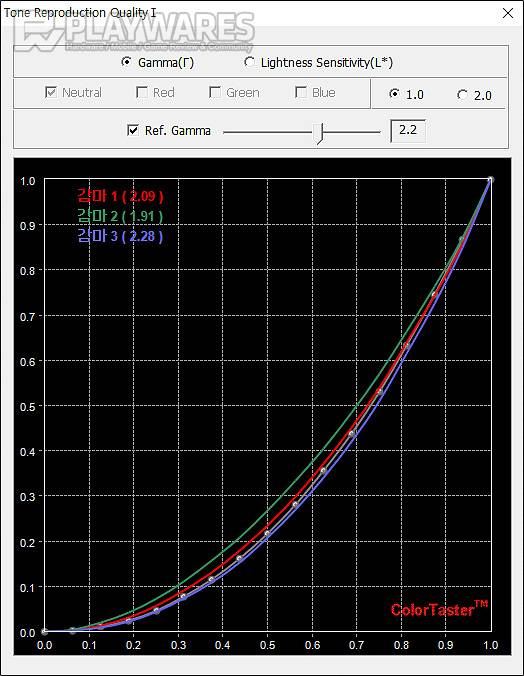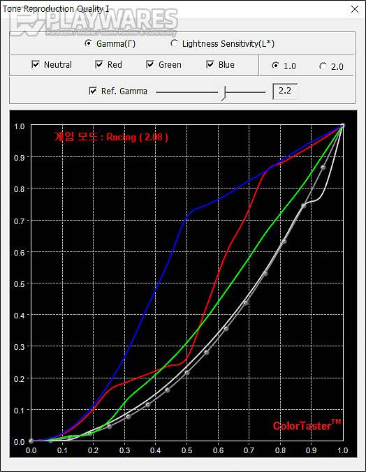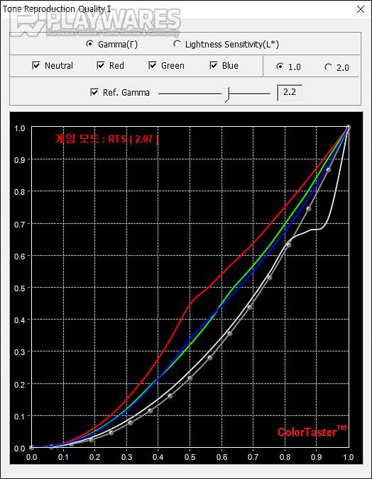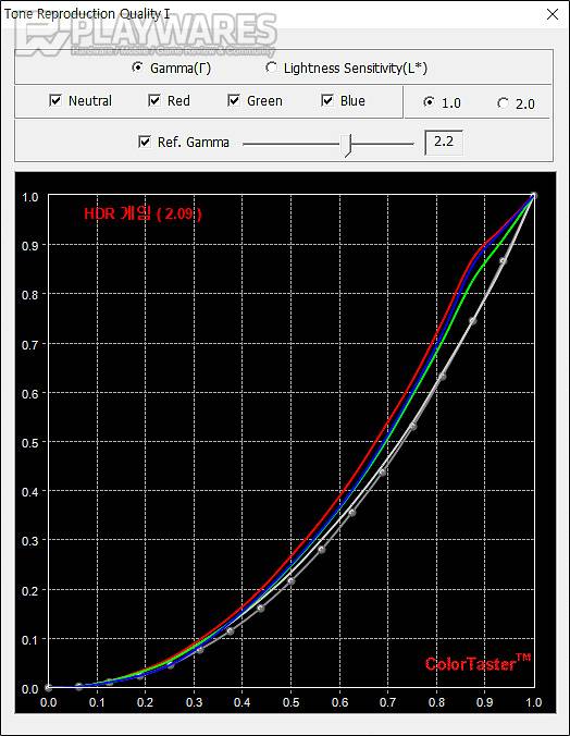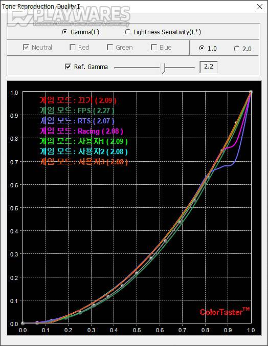 밝기 톤에 영향을 주는 감마 관련, 3단계 감마 모드 선택이 가능하고 그 중 표준 2.2에 가장 가까운 경우는 감마 모드3을 선택한 환경이 되겠습니다. OSD의 게임모드와 HDR 모드 선택 시에는 정해진 프리셋에 따라 밝은 색상이 더욱 화사하게 보여지며 대비를 크게 보이는 화면이 연출되는데 정도에 차이는 있지만 대부분이 이와 유사한 프리셋을 제공하는 형태입니다. 화사함의 정도는 Racing 모드 선택 시 가장 크겠습니다. 이러한 구조를 이용해 게임 장르에 어울리는 화면 연출을 유도해 볼 수 있겠고 다용도 목적에서는 가장 기본이 되는 게임모드와 HDR 모드의 끄기를 선택하는 방법이 있다 하겠습니다.