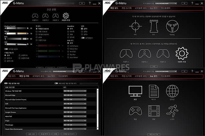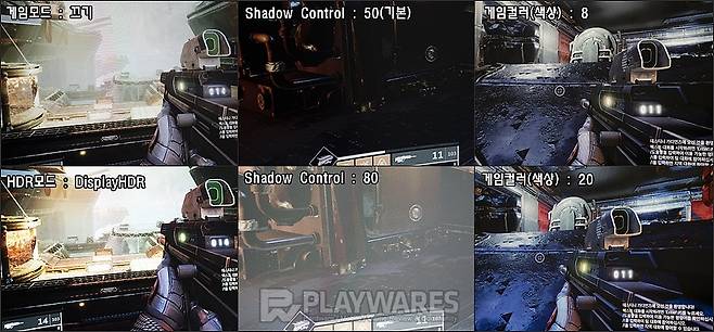 - 게이밍에는 암부 시야 확보를 위한 섀도우 컨트롤 및 조준선, 프레임 카운터가 옵션 선택지로 제공.