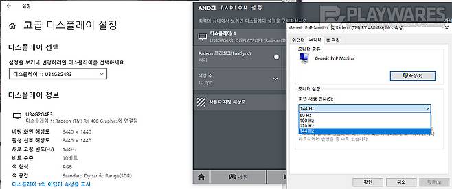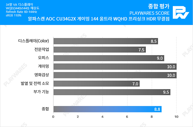 일반적인 16:9 비율 모니터들보다 가로로 표현할 수 있는 해상도가 더욱 많기 때문에 21:9 비율 모니터는 몰입감 측면에 조금 더 강점이 있습니다. 물론, 게임 포함 컨텐츠가 이러한 비율을 온전히 지원하는 경우에 해당하고, 반대의 경우에는 비율 차이에서 오는 화면 여백을 참고해야 하겠지만 말입니다. 와이드뷰 디스플레이 특유의 넓은 화면에서 게임을 즐길 수 있게 만든 것이 이번 알파스캔 AOC CU34G2X 게이밍 144 울트라 WQHD 프리싱크 HDR 무결점이며 핵심 성능에서는 2-4ms대 빠른 응답시간(오버드라이브), 3-4ms 사이로 낮은 인풋렉 제어(Low Input Lag 기술) 성능을 제공하는 것은 물론 WQHD 고해상도에서 주사율 144Hz 설정을 지원하는 점(DP 연결 기준), Adaptive-Sync와 잔상 감소 효과 MBR과 같은 꽤나 쓸만한 옵션을 포함시켰다는 점이 매력인 게이밍 모니터가 되겠습니다.
