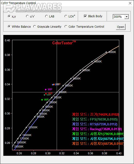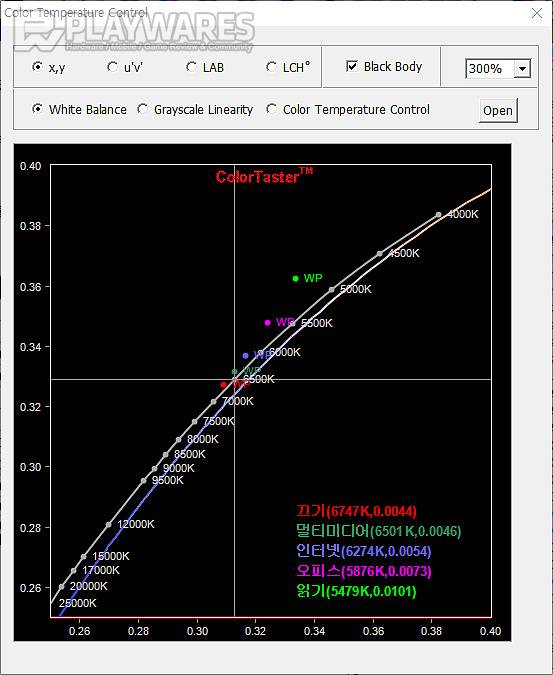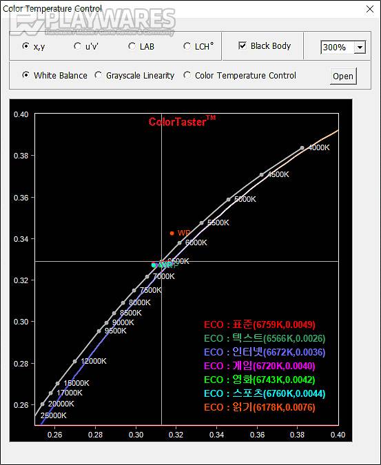 절대온도(K) 수치로 특성을 표현하는 색 온도의 경우 OSD 메뉴를 통해 4가지 타입(따뜻한색, 기본색, 차가운색, sRGB)을 선택할 수 있는데 기본인 따뜻한색과 sRGB 모드가 색 온도 표준 6500K에 가장 가까운 값을 지니게 설정해놓았습니다. 기본색과 차가운색은 점점 더 높은 색 온도로 푸른(Bluish) 느낌이 강해지는 특징이 있으니 참고하시면 좋겠습니다. ECO와 게임모드는 대부분 기본 색 온도 설정을 따라가는데 일부 항목(읽기, 사용자1)에서는 조금 더 높은 색 온도로 차이가 있고 그 외 청색광 차단 모드인 로우블루 모드에서는 기본 끄기에서 시작해 멀티미디어, 인터넷 순으로 청색광 차단 효과가 높아지며 낮은 색 온도(Reddish)가 연출되는 프리셋이 확인됩니다.