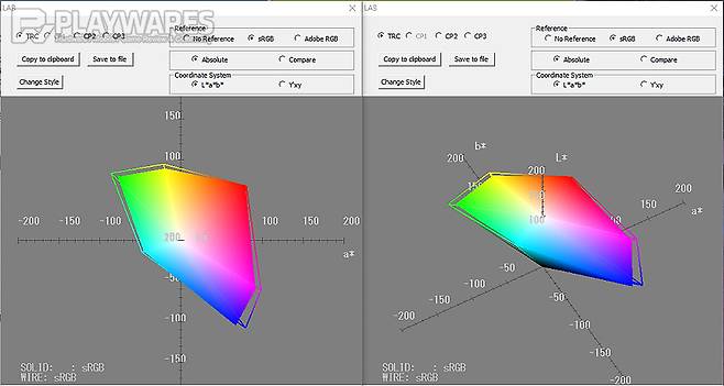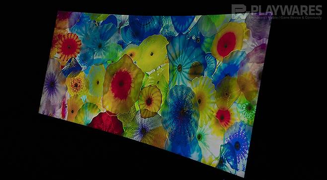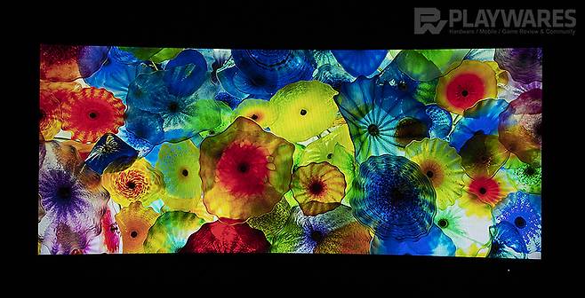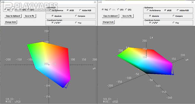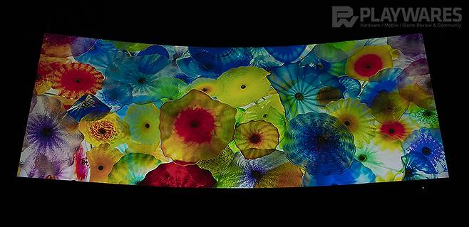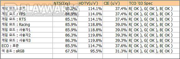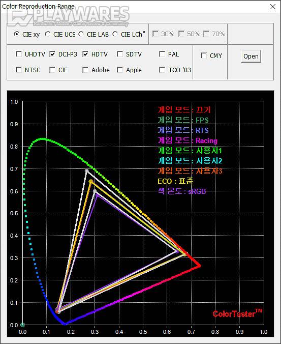 색재현에서는 보편적인 sRGB 색 표준 이상의 넓은 색역 지원이 확인됩니다. 수치상으론 sRGB 최대 118% 수준으로 계측되며 구조는 영화 산업에 쓰이는 DCI-P3 색 표준에 근접해 있는 광색역 디스플레이입니다. 물론 DCI-P3 기준을 모두 만족하는 것은 아니지만 sRGB 색 표준에 최적화되었거나 그에 못미치는 모니터의 화면과 비교할 경우더욱 많은 색상, 디테일한 색상 표현이 가능한 것에 큰 메리트가 있다 하겠습니다. 이는 게이밍 환경에도 적용되며, OSD 메뉴 선택에 따라선 모노톤이 연출되는 ECO : 읽기, 청색광 차단 모드인 로우블루 모드 또는 색 온도가 변경되는 과정에서 색역에 일부 차이가 있는 게 특징입니다.