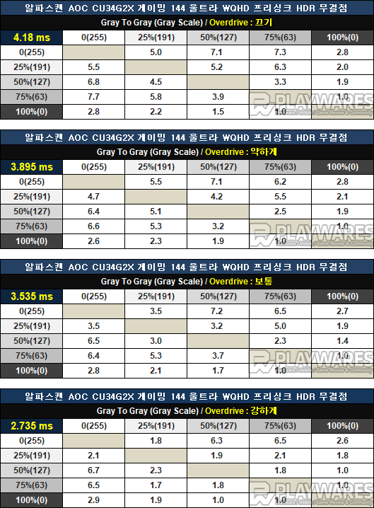 - Overdrive 강하게 기준에서는 화면의 고스팅(역잔상) 현상이 체감되므로 민감한 경우엔 전 단계인 보통을 추천