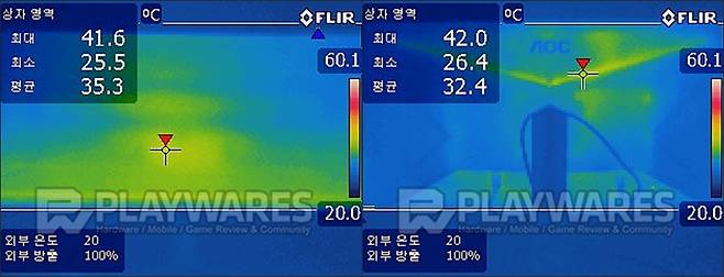 이미지는 화면을 켠 상태에서 에이징을 진행하고, FLIR사의 E시리즈로 본체 발열을 측정한 결과입니다. 본체의 평균 발열은 전후면 32-36˚C 사이, 본체 중앙 및 하단과 뒷면 메인 입력단자 상단쪽에서 상대적으로 높은 41-42˚C의 최대 발열이 확인됩니다.(플레이웨어즈 테스트 환경 기준) 전반적인 발열은 기본 환기를 지켜줄 경우 장시간 사용에서도 특이사항이 없을 수준이겠습니다. 단, 발열 상태는 측정 환경이나 장비에 따라 차이가 발생할 수 있다는 점은 참고바랍니다.