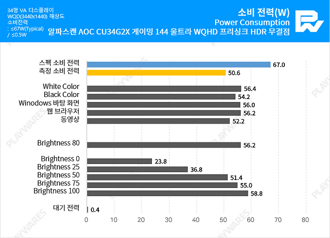 기본 설정으로 제공되는 OSD 밝기 단계 80 기준에서 평균 전력 소모는 50W 초반(플레이웨어즈 테스트 환경 기준), 밝기 단계 100에서 가장 높은 58.8W 전력 소모가 확인됩니다. 전반적인 항목에서 표기 스펙 67W 이내의 전력 소모 상태를 보여주고 있고 밝기 단계를 50이하로 낮출 때 전력 소모가 크게 감소하는 특징이 있습니다. 대기전력의 경우 평균 0.3-0.4W의 값을 확인할 수 있습니다.