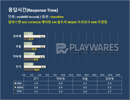 색상 전환 및 잔상 특성과 연관되는 응답시간의 경우, OSD 메뉴의 3단계 Overdrive가 옵션으로 제공됩니다. 기본 끄기 설정 기준 응답시간은 4ms 초반대, 단계별 오버드라이브 효과가 확인되는 가운데 최고 설정 강하게 기준에서는 최대 2ms대 응답시간 오버드라이브 환경이 제공되는 특징이 있습니다. 물론, 강하게 기준에서는 오버드라이브가 강하게 걸리면서 고스팅(역잔상) 현상이 체감되므로 최적의 환경으론 전 단계인 보통(3ms대)을 추천하겠습니다. 응답시간은 전반적으로 5ms 이내의 준수한 수치를 보여주고 있으므로 빠르고 쾌적한 게이밍에 어울리는 성능의 하나라 할 수 있겠습니다. (데이터는 플레이웨어즈 테스트 환경 기준이며 테스트 환경이나 방식에 따라 어느정도의 편차는 존재하겠습니다. 잔상이나 역잔상을 체감하는 부분 역시 개인차가 존재하는 영역이므로 해당 사항을 참고해 주시기 바랍니다.)
