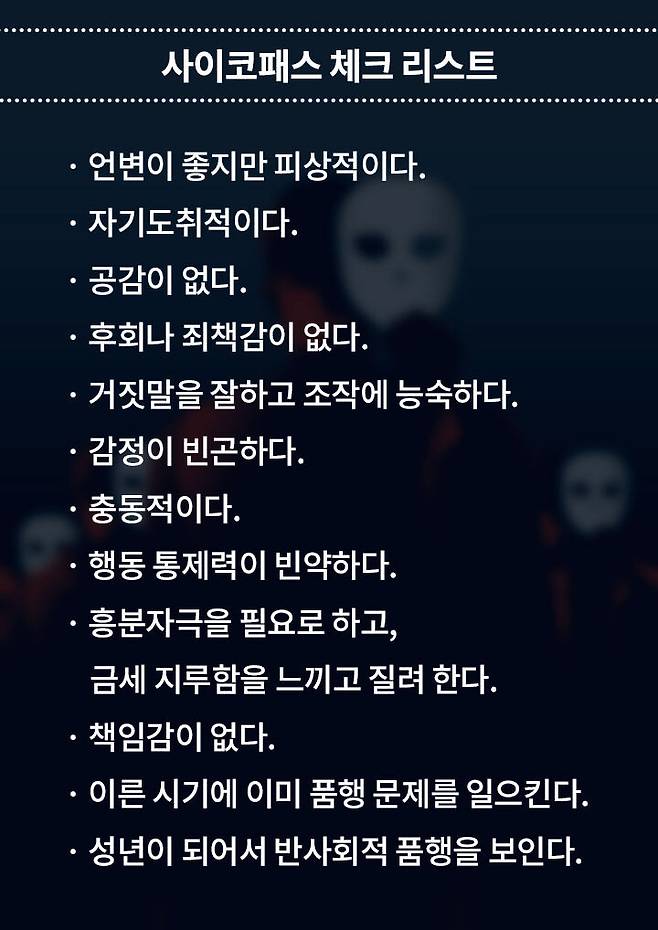 사이코패스의 세계적인 연구가인 로버트 헤이어는 사이코패스 체크리스트를 제시했는데, 다음과 같이 12가지로 요약된다.