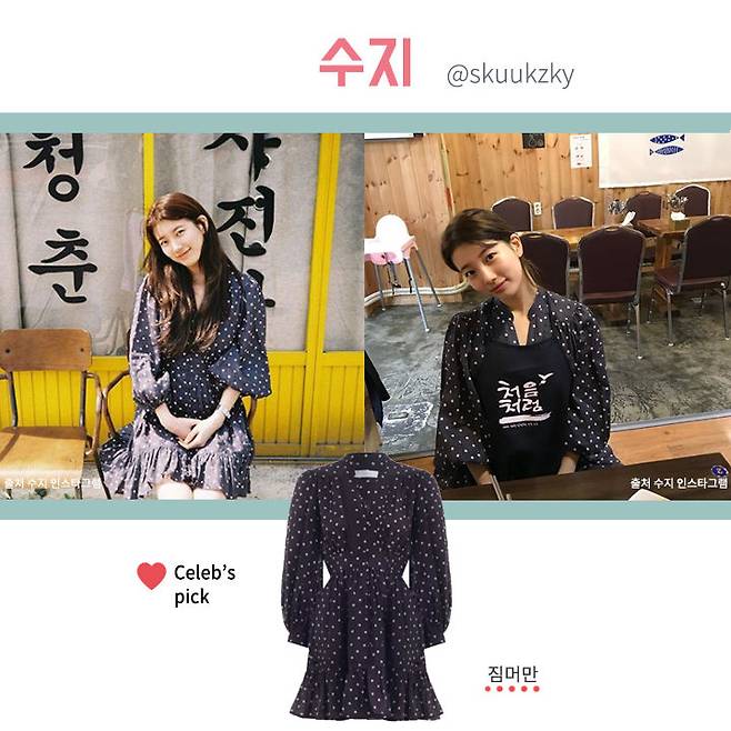 다음은 청순함의 대명사 수지~ 수지가 얼마 전에 올린 이 사진 때문에 너도 나도 도트 원피스를 샀다지..ㅎㅎ가끔 인스타그램에 올려주는 일상 사진은 소장각!