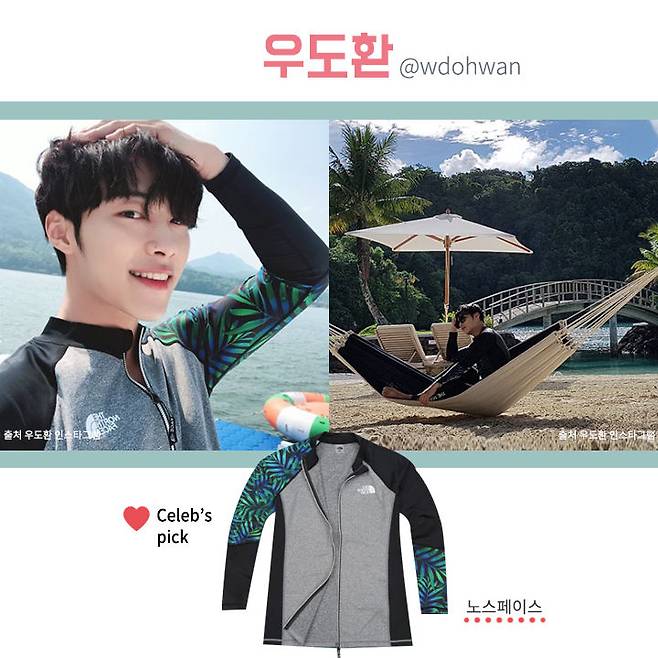 여름 휴가를 계획 중이라면 우도환이 선택한 래시가드를 눈여겨보자~ 부담스럽지 않은 모노톤 컬러에 트로피컬 패턴이 포인트로 들어가 꾸.안.꾸 래시가드 스타일링을 연출할 수 있는 우도환의 아이템 강추!