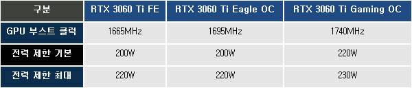 이는 각 제품의 GPU 특성으로도 알 수 있다. 두 제품 다 엔비디아 파운더스 에디션의 GPU 부스트 클럭인 1665MHz보다 높게 오버클럭 되었는데, RTX 3060 Ti 이글 OC의 GPU 부스트 클럭은 1695MHz, RTX 3060 Ti 게이밍 OC의 GPU 부스트 클럭은 1740MHz이다.