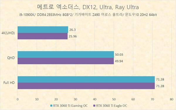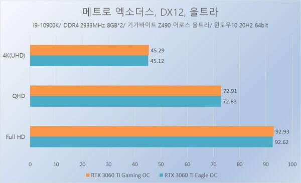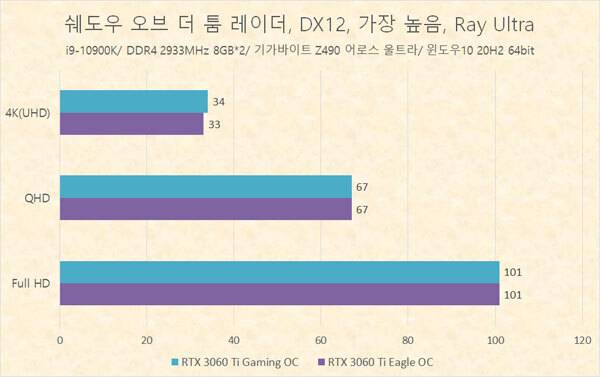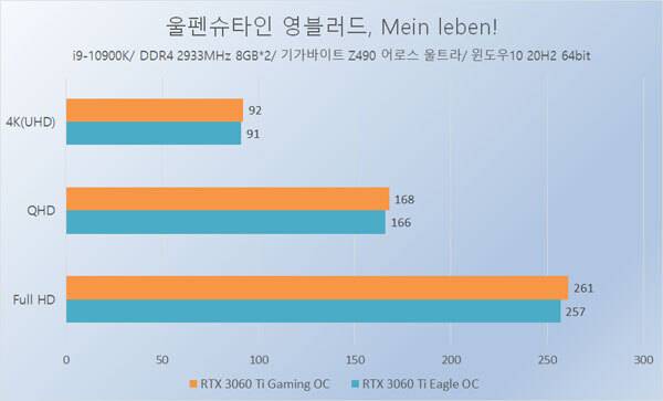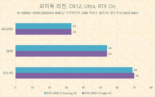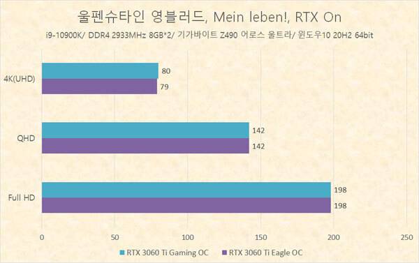 엔비디아 지포스 RTX 3060 Ti는 RTX 2060 Super의 가격에 RTX 2080 Super급 성능을 내주는 퍼포먼스 그래픽 카드인 덕에, 기가바이트 지포스 RTX 3060 Ti 게이밍 OC 제이씨현과 기가바이트 지포스 RTX 3060 Ti 이글 OC 제이씨현 그래픽 카드의 성능 차이가 있긴 하지만, 거의 동급인 것을 확인할 수 있었다.