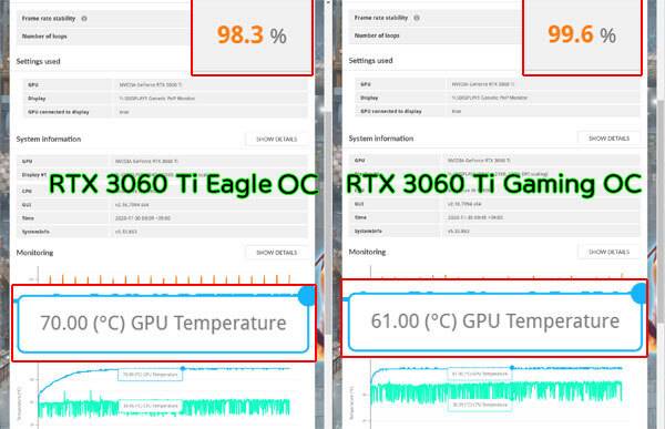 온도와 프레임 유지율 모두 지포스 RTX 3060 Ti 게이밍 OC가 상대적으로 우수한 모습을 보였지만, RTX 3060 Ti 이글 OC 또한 풀 로드 상태서 최대 온도 70℃로 괜찮은 쿨링 성능을 발휘하면서, 프레임 유지율도 98.3%의 준수한 수치를 기록했다.