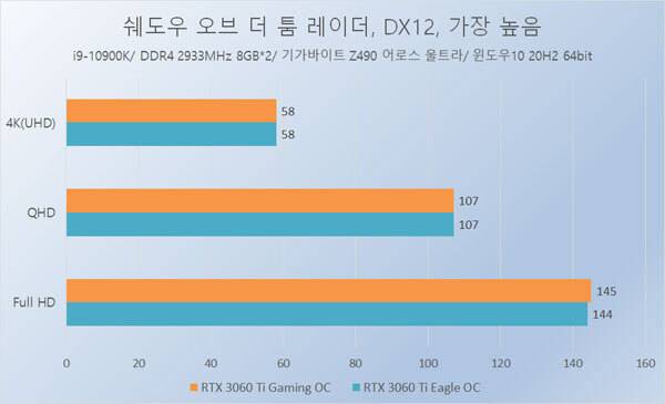 일부 게임에서 성능 차이가 레이 트레이싱을 적용했을 때보다 커지긴 했지만, 이번에도 두 제품의 성능 차이는 제품 선택을 좌우할 정도로 크다고 보긴 어렵고, 전체적으로 RTX 3060 Ti 게이밍 OC가 소폭 높은 결과를 내줬다.