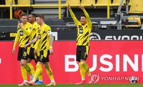 epa09185410 Dortmund's Jadon Sancho (R) celebrates his 2-0 goal during the German Bundesliga soccer match between Borussia Dortmund and RB Leipzig in Dortmund, Germany, 08 May 2021. EPA/FRIEDEMANN VOGEL / POOL CONDITIONS - ATTENTION: The DFL regulations prohibit any use of photographs as image sequences and/or quasi-video.