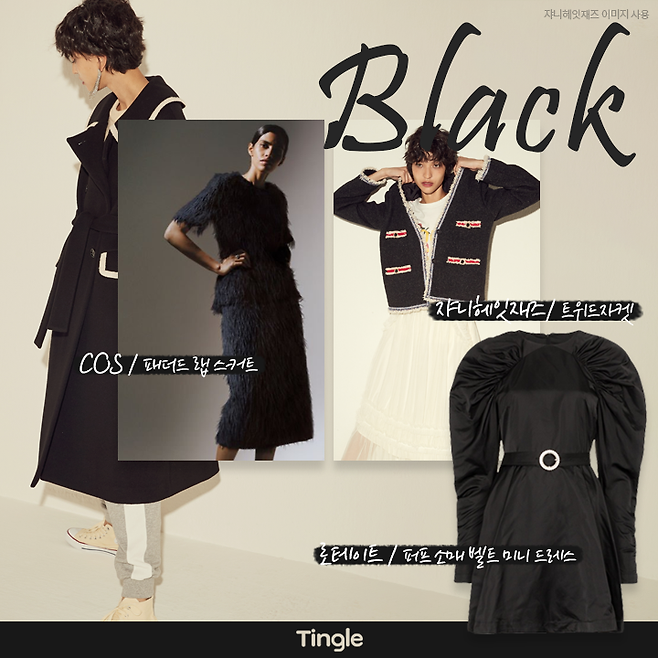로맨틱 블랙 스타일로는 퍼프 숄더와