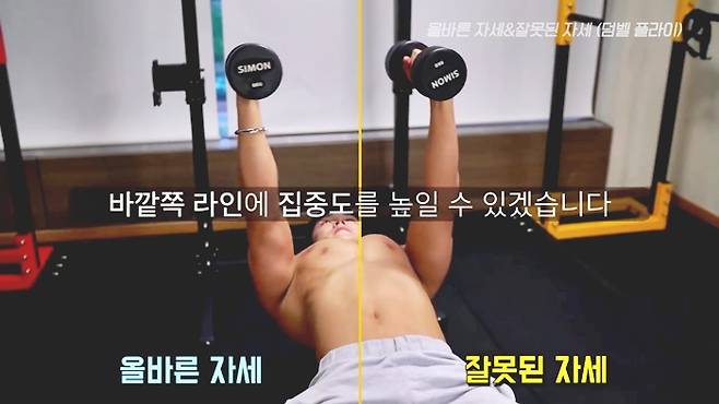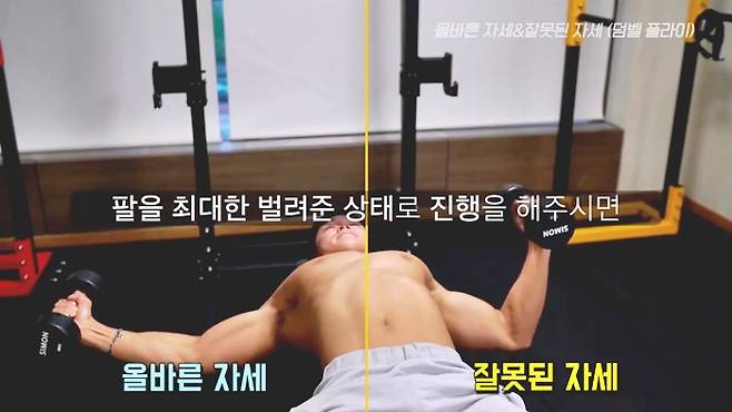 이렇게 자세를 정확히 파악하셔서 직접 해보시고, 가슴운동 덤벨 플라이 동작을 진행해보세요. 느끼는 자극의 정도가 달라집니다.