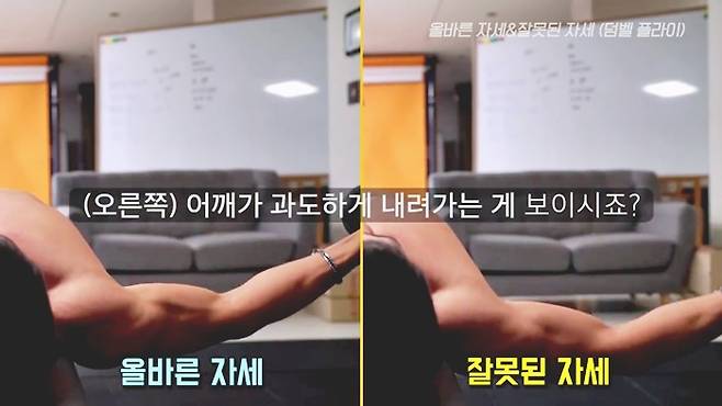 어깨가 많이 내려가면 자극이 분산되니 잘 보고 따라해주세요.