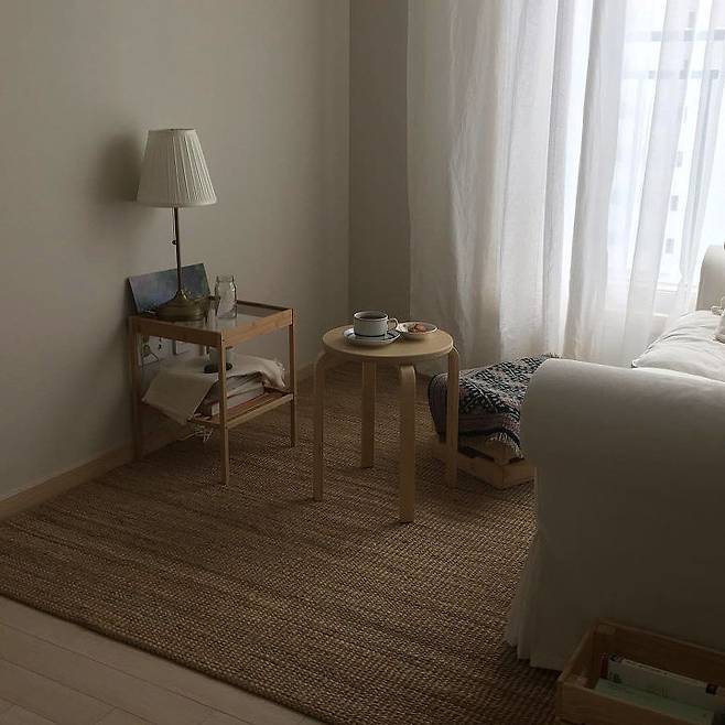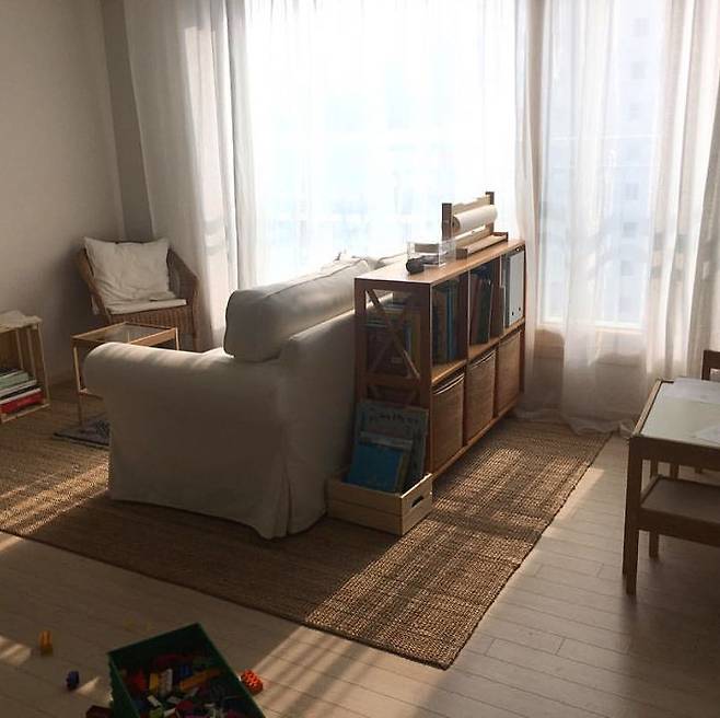 커튼 : 이케아 LENDA 화이트 / 양초 : 이케아 HEMSJO 8cm / 협탁 : 이케아 NESNA 침대협탁 / 책장 : 퍼니처랩 3x2 크로스책장 / 속커튼 : 이케아 TERESIA 화이트 / 해초바구니 : 마켓비 BELY 해초 바구니 / 의자 : 이케아 AGEN 의자, 라탄, 대나무 / 액자 : 무인양품 벽걸이프레임 엽서사이즈용 / CD플레이어 : 무인양품 벽걸이 CD플레이어 / 스툴 : 이케아 FROSTA 스툴, 자작나무 합판 / 소파 : 이케아 EKTORP 3인용소파, 로팔레트 베이지 / 탁상스탠드 : 이케아 ÅRSTID 탁상스탠드, 황동, 화이트 / 어린이 테이블, 의자 : 이케아 LÄTT 어린이테이블+의자2, 화이트, 소나무 / 러그 : 이케아 LOHALS 평직러그 내추럴 (큰것), 이케아 단모러그 (작은것)