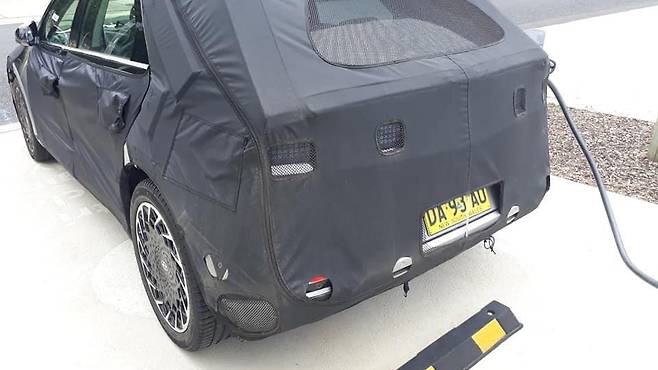 아이오닉 5는 위장막을 두른 프로토타입으로 호주 배서스트에 있는 NRMA 급속 충전기에서 충전하는 모습이다.