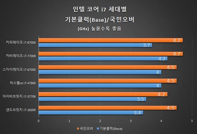 세대별 코어 i7 시리즈 제품들을 기준으로 샌디브릿지 시절부터 현재 커피레이크 제품까지, 커뮤니티에서 거론되고 있는 국민오버 클럭 수치를 그래프로 표현해보았다.